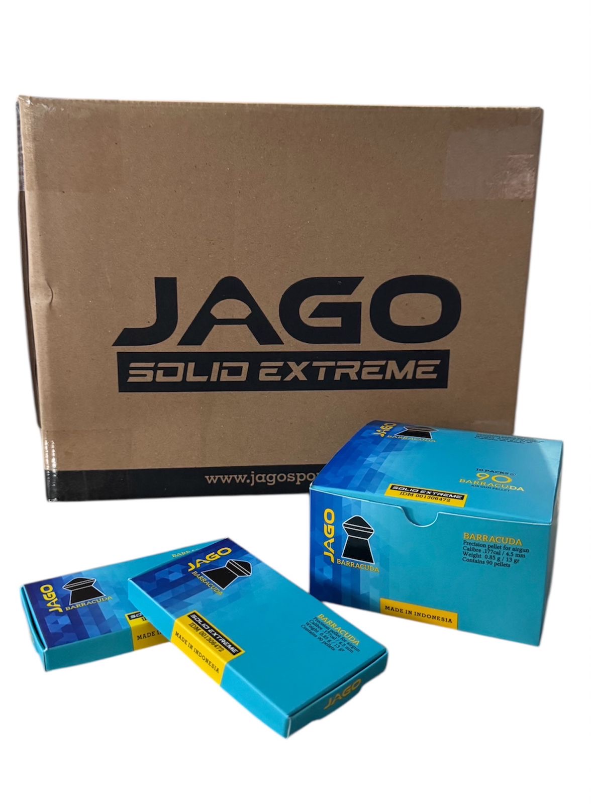 JAGO BARRACUDA solid extreme adalah mimis yang berbentuk baru di indonesia spesifikasi : > isi 10 slop/100 pack > kalibre 4,5 mm/177 cal > berat 13 gr/0,85 g > kepala domed > belakang papak